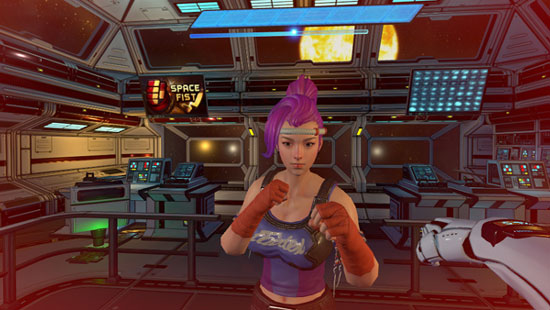 為了迎合VR獨(dú)特的沉浸體驗(yàn),《Space fist》開發(fā)商擯棄了常規(guī)的第三人稱視角,轉(zhuǎn)而選擇讓玩家“扮演”選取的角色,進(jìn)而與對手臉貼臉競技。這么做的好處顯而易見,第一人稱通常能做出更好的反饋:諸如擊打和防御時(shí)更為擬真的震動(dòng)觸覺,以及貼近真實(shí)的距離掌握。