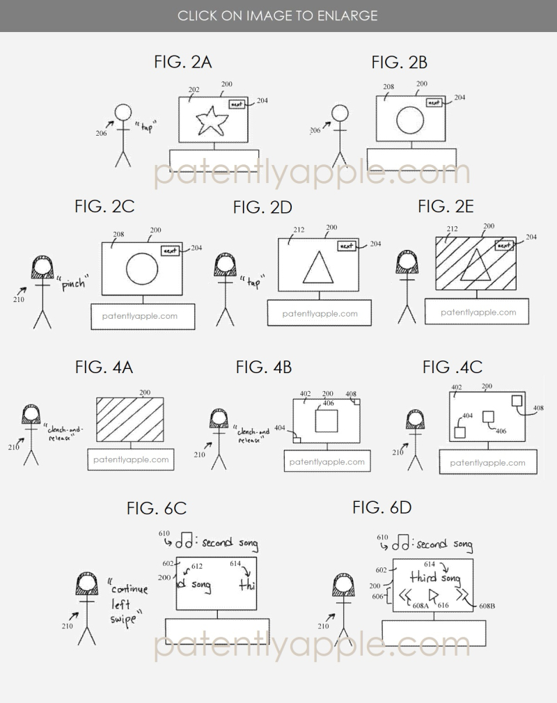 依據(jù)某些實(shí)施例,圖2A – 2E展示了響應(yīng)空中手勢(shì)的技術(shù)方案,其中,專利所述的計(jì)算機(jī)系統(tǒng)#200即為一臺(tái)電視機(jī)。圖4A – 4C呈現(xiàn)了在不同情境下對(duì)相同空中手勢(shì)的響應(yīng)技術(shù),圖6A – 6D則展示了針對(duì)不同類型空中手勢(shì)的響應(yīng)技術(shù)。該專利所涉及的空中手勢(shì)豐富多樣,包含輕敲、捏合、握拳與松開、滑動(dòng)、輕彈等各類手勢(shì),以及手指手勢(shì)和組合手勢(shì)。