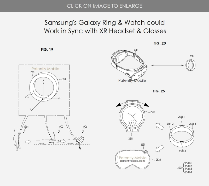 從專利附圖來看,圖19生動呈現(xiàn)了智能環(huán)設(shè)備佩戴方向識別功能的運(yùn)作場景。畫面中,佩戴著Galaxy Ring的手部進(jìn)行著全方位的動態(tài)操作,通過捕捉這些精細(xì)的動作軌跡,該設(shè)備能夠精準(zhǔn)地對XR頭顯的用戶界面進(jìn)行導(dǎo)航控制,為用戶帶來更為直觀和流暢的交互體驗(yàn)。?