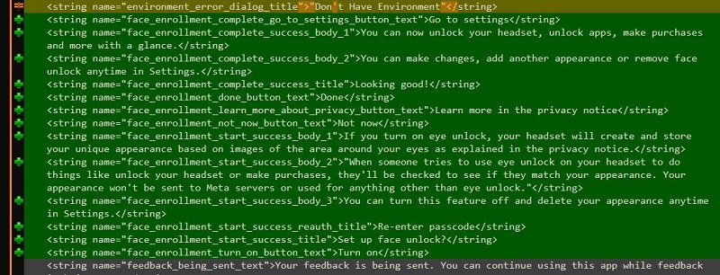 在v77 PTC 版本中,新添加的字符串信息揭示了Meta在用戶身份驗(yàn)證領(lǐng)域的新探索。Meta 正在積極研發(fā)一項(xiàng)名為“Face Enrollment”的功能,旨在為Horizon OS引入基于眼動(dòng)追蹤的用戶身份驗(yàn)證方式。這一功能將作為現(xiàn)有密碼系統(tǒng)之外的額外安全保障選項(xiàng),進(jìn)一步提升用戶賬戶和數(shù)據(jù)的安全性。?