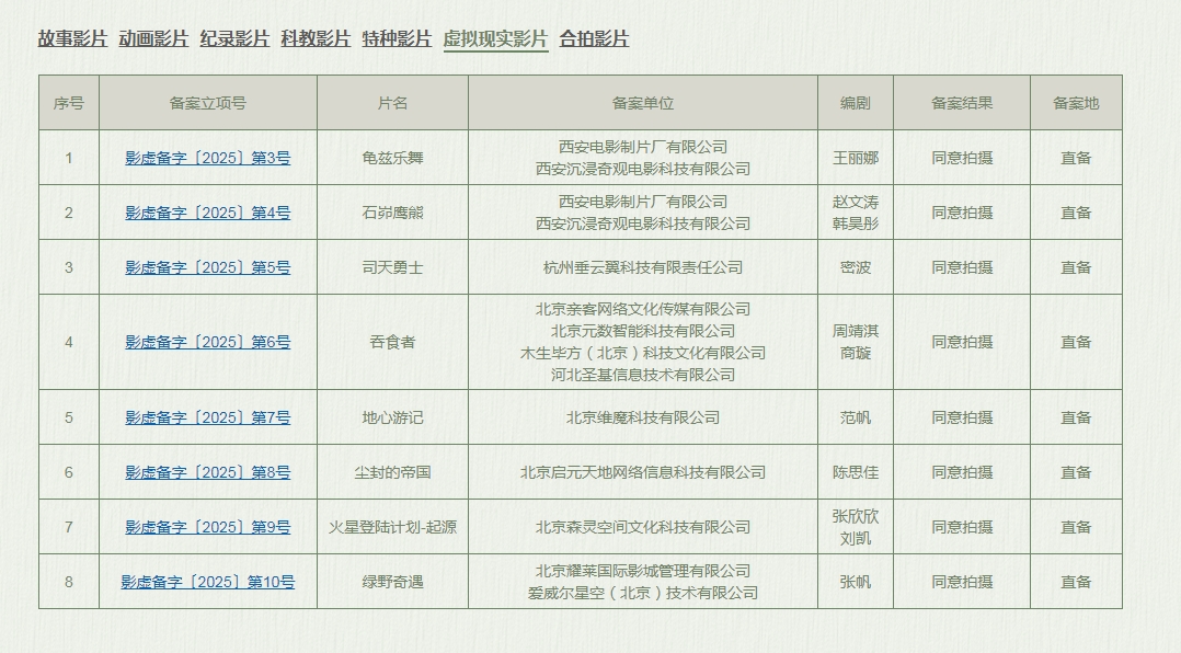 6月4日,國家電影局發(fā)布《關于2025年4月下全國電影劇本(梗概)備案、立項公示的通知》。在本期公示中,共有8部虛擬現(xiàn)實電影項目成功獲得備案立項,它們分別是《龜茲樂舞》《石峁鷹熊》《司天勇士》《吞食者》《地心游記》《塵封的帝國》《火星登陸計劃-起源》以及《綠野奇遇》。這些項目由北京、陜西、杭州等地區(qū)的制作公司申報,內(nèi)容涵蓋歷史文化、神話、冒險等多個題材方向,充分展現(xiàn)出虛擬現(xiàn)實電影在內(nèi)容層面與地域合作方面的進一步拓展。