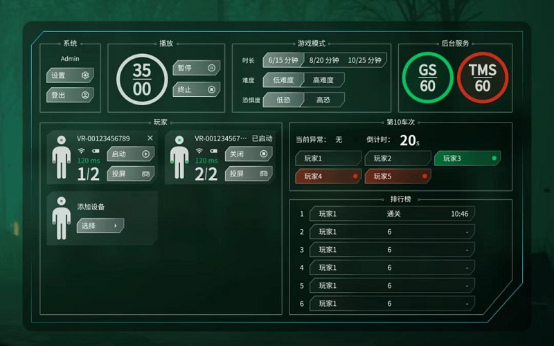 自定義的管理后臺擁有全面的播放統(tǒng)計系統(tǒng)、設(shè)備狀況實時監(jiān)控、難度、恐怖度調(diào)節(jié)和玩家積分排行榜統(tǒng)計,方便運營方隨時復(fù)盤運營狀況,制定和調(diào)整運營策略。