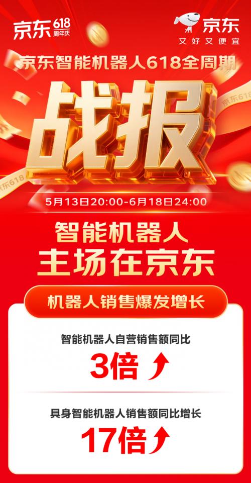 今年京東618期間,海量具身智能機器人在線上線下火爆出圈,成為全網(wǎng)熱議的話題。這一熱度在銷售數(shù)據(jù)方面得到充分表現(xiàn)。京東618全周期戰(zhàn)報數(shù)據(jù)顯示,5月13日20點到6月18日24點,智能機器人自營銷售額同比增長3倍,具身智能機器人銷售額同比增長17倍。