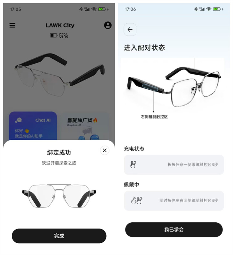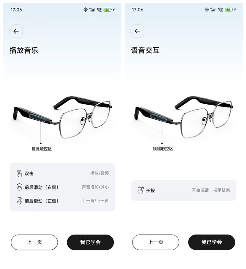 在操作體驗(yàn)上,李未可City AI眼鏡的觸控操作設(shè)計(jì)簡(jiǎn)潔且實(shí)用。雙擊觸控區(qū)域,即可實(shí)現(xiàn)音樂的播放/暫停;在左側(cè)鏡腿觸控區(qū)域前后滑動(dòng),便能輕松切換歌曲;在右側(cè)鏡腿觸控區(qū)域前后滑動(dòng),則可調(diào)節(jié)音量大小。長(zhǎng)按任意鏡腿觸控區(qū),即可喚醒AI助手并開始收音,松手即結(jié)束收音。實(shí)際體驗(yàn)中,觸控操作響應(yīng)迅速,無(wú)論是滑動(dòng)操作還是其他觸控指令,都極為靈敏,使用起來(lái)流暢自然,帶來(lái)了極佳的交互體驗(yàn)。?