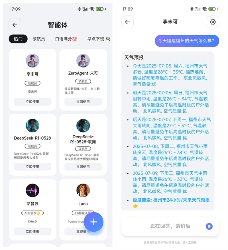 進(jìn)入實(shí)際操作階段,李未可City AI眼鏡的智能體驗(yàn)更是令人驚艷。長(zhǎng)按觸控區(qū),便能迅速喚醒內(nèi)置語(yǔ)音助手。而其豐富多樣的智能體,堪稱一大亮點(diǎn)。李未可City AI眼鏡提供了包括熱門、領(lǐng)航員、口語(yǔ)滿分、早點(diǎn)下班、AI新朋友、好運(yùn)連連、旅行搭子等在內(nèi)的多種智能體,每個(gè)AI智能體都具備不同的特色和技能,能滿足用戶在不同場(chǎng)景下的多樣化需求。以默認(rèn)的李未可智能體為例,當(dāng)我詢問天氣情況時(shí),它迅速且準(zhǔn)確地給出了天氣預(yù)報(bào),反應(yīng)之靈敏、回答之精準(zhǔn),讓人不禁贊嘆其強(qiáng)大的智能交互能力。?