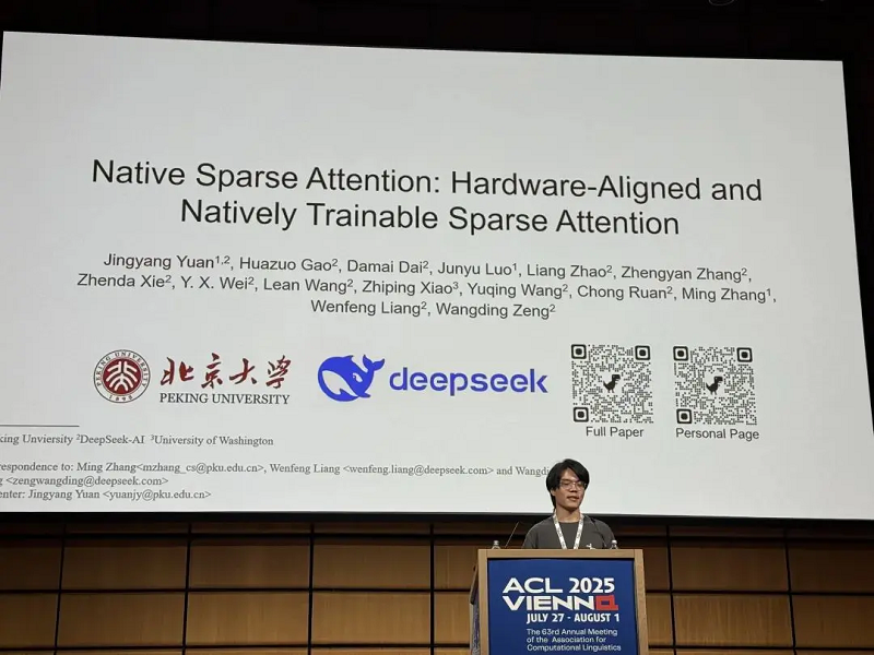 這篇獲獎?wù)撐奶岢隽嗽∈枳⒁饬Γ∟SA)機(jī)制,長久以來,大語言模型處理長文本就像是戴著鐐銬跳舞。傳統(tǒng)的全注意力機(jī)制計(jì)算復(fù)雜度隨序列長度呈平方級增長,處理64k長度的文本時(shí),注意力計(jì)算竟然要占到總延遲的70-80%。而NSA機(jī)制通過算法與硬件的協(xié)同優(yōu)化,直接把長文本處理速度提升了11倍,性能不僅沒降,反而還超越了傳統(tǒng)的全注意力模型。一作袁境陽在會上發(fā)表演講時(shí),透露這項(xiàng)技術(shù)可以把上下文長度擴(kuò)展到1百萬tokens,將被應(yīng)用到下一個(gè)前沿模型中。結(jié)合論文發(fā)表于DeepSeek-R1推出之后,實(shí)驗(yàn)設(shè)置中也提到使用了DeepSeek-R1的蒸餾數(shù)據(jù)來微調(diào)新的模型,大家紛紛猜測,這項(xiàng)技術(shù)將被用于下一代DeepSeek-V4以及DeepSeek-R2。