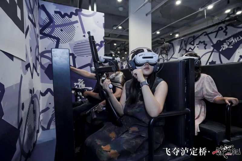 《飛奪瀘定橋?渡河紀(jì)》全感互動空間以“飛奪瀘定橋”歷史事件為主題,依托先進(jìn)的VR技術(shù),結(jié)合3D建模、動態(tài)捕捉和全景聲效,1:1還原歷史場景。項目設(shè)有9大關(guān)卡、5類地形,以真實發(fā)生為主線層層遞進(jìn),能讓觀眾在30分鐘的沉浸式體驗里真實走入“戰(zhàn)場”。當(dāng)用戶戴上VR頭顯,會即刻回到1935年5月29日下午4點的瀘定橋西頭,耳邊是戰(zhàn)役指揮員下達(dá)的射擊命令,眼前則是22名突擊隊員冒著槍林彈雨,在只剩13根鐵索的瀘定橋上拼命攀爬的壯烈景象,用戶仿佛親身參與了紅軍當(dāng)年的這場壯舉,沉浸在那段歷史的氛圍中,擁有身臨其境之感,能實實在在觸摸到當(dāng)年的歷史情景。?