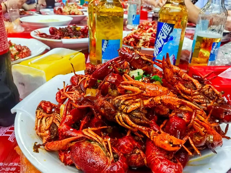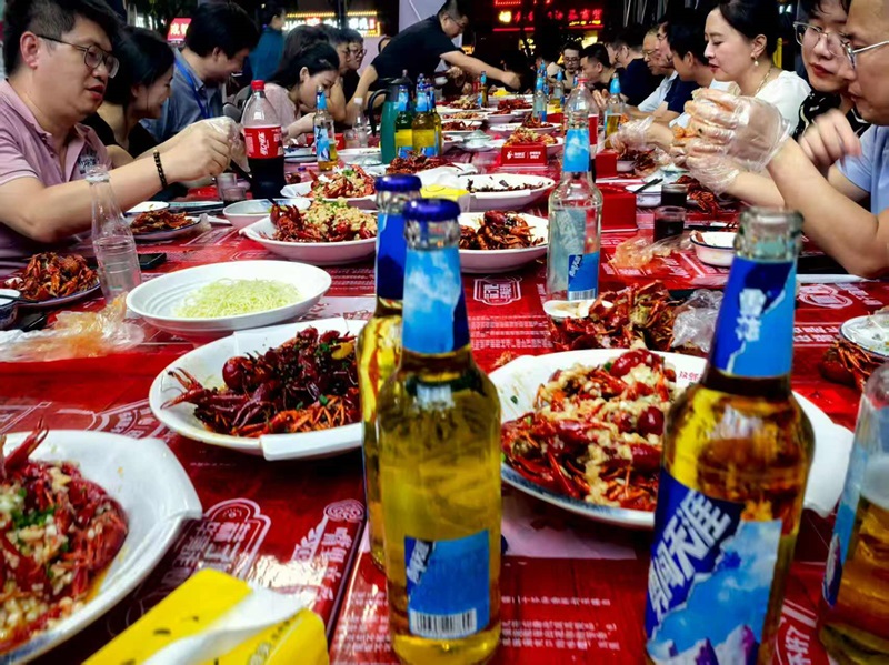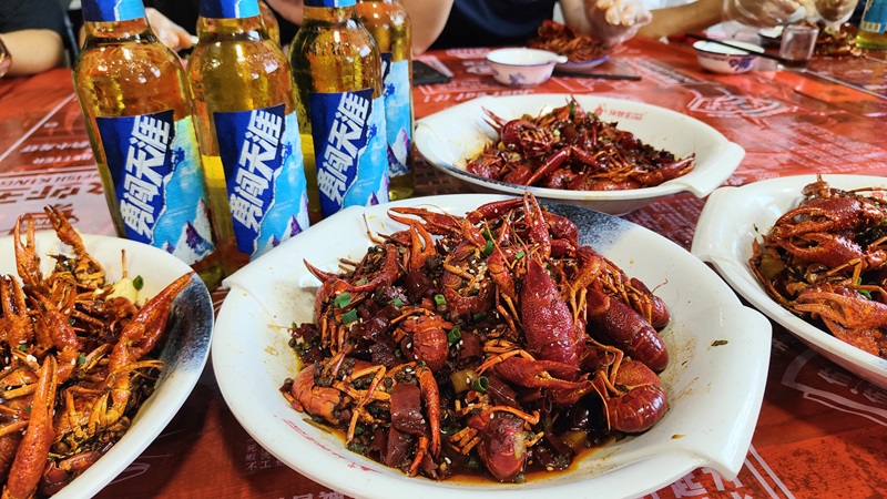 活動現(xiàn)場人頭攢動,處處洋溢著輕松愉悅的氛圍。剛走進(jìn)場地,濃郁的龍蝦香氣便撲面而來,瞬間勾起人們的食欲。長桌上整齊擺放著一盆盆色澤誘人的龍蝦,十三香、蒜蓉、麻辣等多種口味一應(yīng)俱全,滿足著不同人的味蕾需求;不僅如此各式冰爽啤酒琳瑯滿目,為這場夏日盛宴增添了幾分清涼。