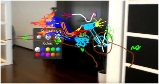 我們嘗試了多種方式讓手與增強(qiáng)現(xiàn)實(shí)進(jìn)行交互,把你的手靠在立方體上,然后被推開。雖然這種非常直接的物理交互感覺相當(dāng)現(xiàn)實(shí),但實(shí)際上并不實(shí)際。因此,我們決定提出一個(gè)更多關(guān)于創(chuàng)建的概念,而不是操縱對象,這就誕生了HoloDoodle。