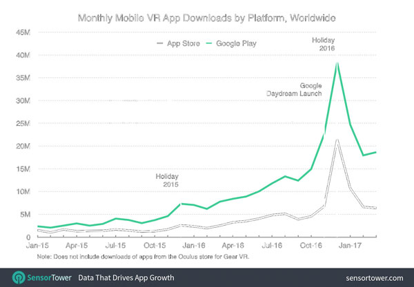 數(shù)據(jù)表明,從2015年1月以來,蘋果商店中支持VR功能的應(yīng)用就獲得了約1億600萬次的下載量。蘋果商店中的很多VR應(yīng)用是在2016年12月的時(shí)候下載的,因?yàn)槟菚r(shí)候由于假日季很多用戶收到了VR眼鏡盒子。