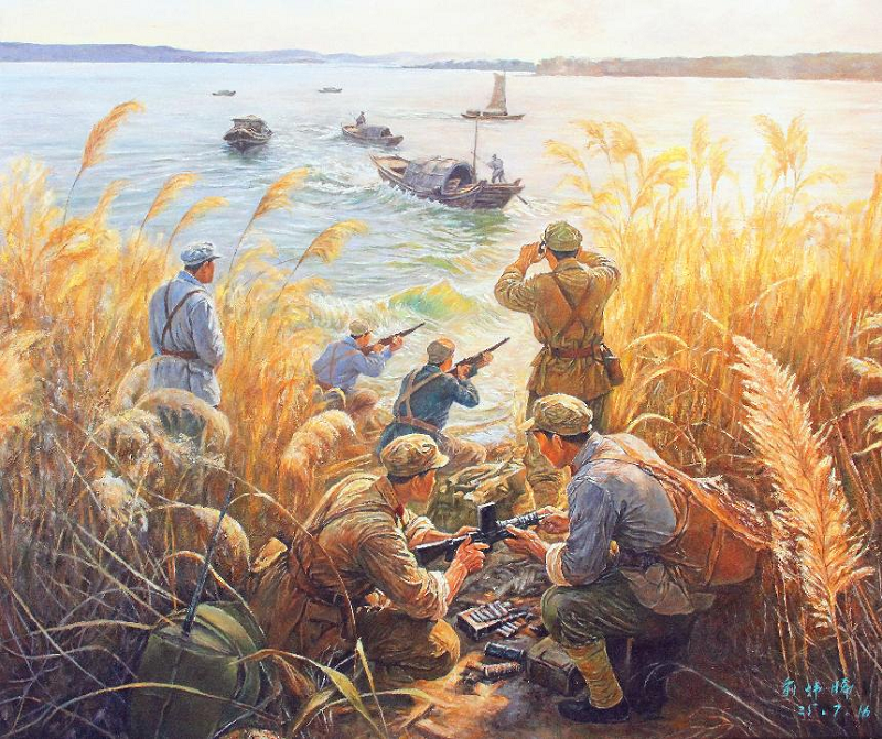 2025另一幅作品《太湖抗日游擊隊(duì)》出自青年油畫(huà)藝術(shù)家俞煒晞之手。這幅作品以現(xiàn)實(shí)主義筆觸刻畫(huà)了太湖地區(qū)抗日戰(zhàn)士們的英勇事跡,蘆葦蕩中的隱蔽作戰(zhàn)、水面上的船只調(diào)度,每一處細(xì)節(jié)都凝聚著作者對(duì)歷史的敬畏。而AR技術(shù)將進(jìn)一步激活這幅畫(huà)面——掃描之后,畫(huà)面中的水域?qū)⒎浩饾i漪,蘆葦隨風(fēng)搖動(dòng),戰(zhàn)士們的動(dòng)作由靜轉(zhuǎn)動(dòng),槍械、船只、裝備皆可360度查看,背景音效中隱約傳來(lái)風(fēng)聲、水聲與遠(yuǎn)方的號(hào)角。觀眾仿佛穿越時(shí)空,親臨那段崢嶸歲月,感受英雄們堅(jiān)定的目光與不屈的精神。