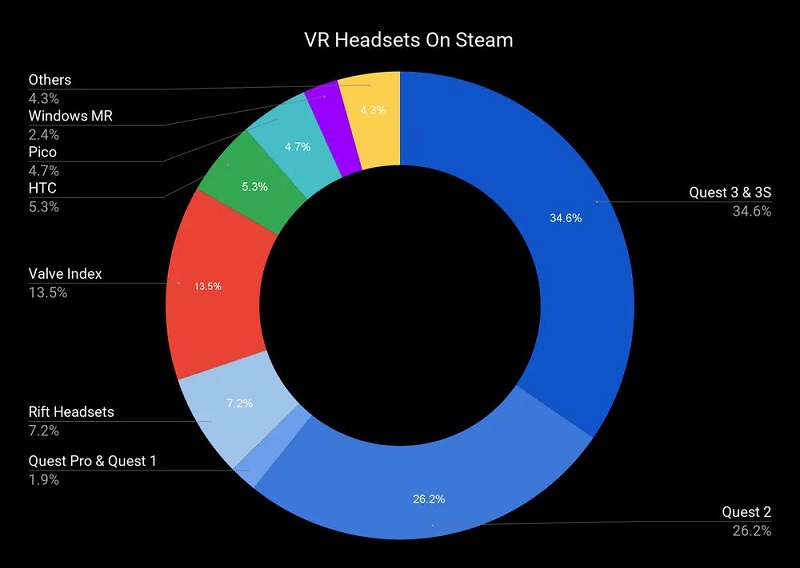 根據(jù)Valve于9月發(fā)布的Steam硬件與軟件調(diào)查數(shù)據(jù)顯示,Meta Quest 3與Meta Quest 3S的使用份額合計達34.6%,高于Quest2的26.17%。?