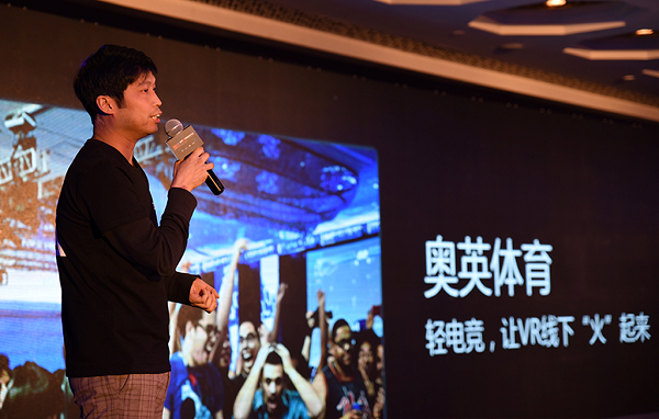 奧英體育,是用輕電競手段讓VR線下“火“起來的一套體系。這一塊我覺得讓我們專注線下運營的的子公司奧英體育總經(jīng)理蔡震來講更適合,我們有請蔡震。