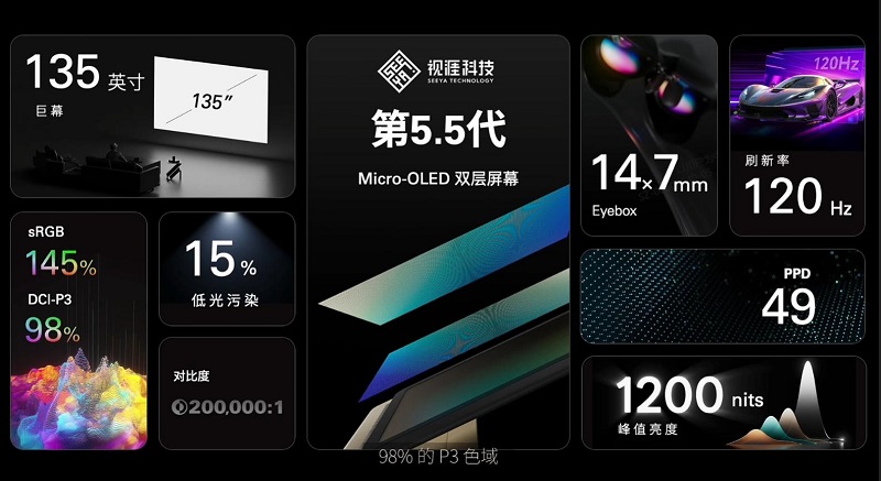 顯示屏幕方面,該眼鏡采用視涯科技最先進(jìn)的第5.5代Micro-OLED雙層屏幕,擁有135英寸巨幕效果,120Hz高刷新率,峰值亮度可達(dá)1200nits,對(duì)比度高達(dá)200000:1,98%的P3廣色域,能呈現(xiàn)10bit 10.7億色的豐富色彩,色彩豐富度較8bit屏幕提升64倍。此外,其獨(dú)特的孔雀光學(xué)引擎2.0,進(jìn)一步提升了畫(huà)面的亮度和動(dòng)態(tài)范圍,配合多檔Gamma曲線調(diào)節(jié)以及電影模式、標(biāo)準(zhǔn)模式、護(hù)眼模式三類畫(huà)質(zhì)模式,滿足不同場(chǎng)景下的視覺(jué)需求。