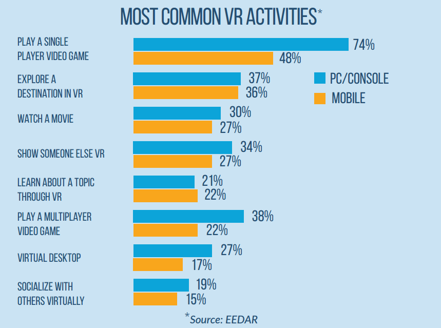另一部分的調(diào)查主要集中在MR,其結(jié)果更讓人興奮。有19%的開發(fā)商表示他們目前正在為Oculus Rift開發(fā)游戲,8%的開發(fā)商正在為Gear VR開發(fā)游戲,7%的開發(fā)商正在為谷歌紙盒眼鏡開發(fā)游戲。為HTC Vive以及PS VR平臺開發(fā)游戲的開發(fā)商比例均為6%。