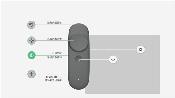 Pico Goblin動(dòng)作手柄基于藍(lán)牙協(xié)議4.1,低功耗、連接穩(wěn)定,正面是簡(jiǎn)約的“三按鍵布局”:頂部是返回鍵,中間是點(diǎn)擊式觸摸板,底部logo鍵用于藍(lán)牙連接及畫面校準(zhǔn)。