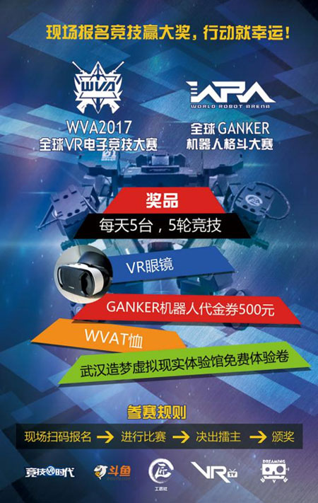 不僅如此,作為本屆斗魚嘉年華的一大亮點,競技時代聯(lián)合斗魚平臺、工匠社、VRTV及武漢造夢虛擬現(xiàn)實體驗館,在3天活動期間推出WVA2017全球VR電競大賽武漢公開賽,WRA2017全球Ganker機器人格斗大賽武漢公開賽,選手們還有機會現(xiàn)場挑戰(zhàn)女團、明星主播,并參與抽取豐厚大獎!還在等什么,快快加入吧!