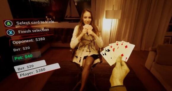 《撲克秀VR》是一款?yuàn)蕵沸再|(zhì)的虛擬現(xiàn)實(shí)撲克游戲:玩家要和現(xiàn)實(shí)生活中的時(shí)裝模特玩五張抽撲克游戲,不是AI,是真的美女模特們,更重點(diǎn)來了,模特輸?shù)舻脑挄?huì)在你的面前一件一件脫掉身上的衣服。是否能欣賞到讓你滿意的畫面,就靠玩家自己努力啦!