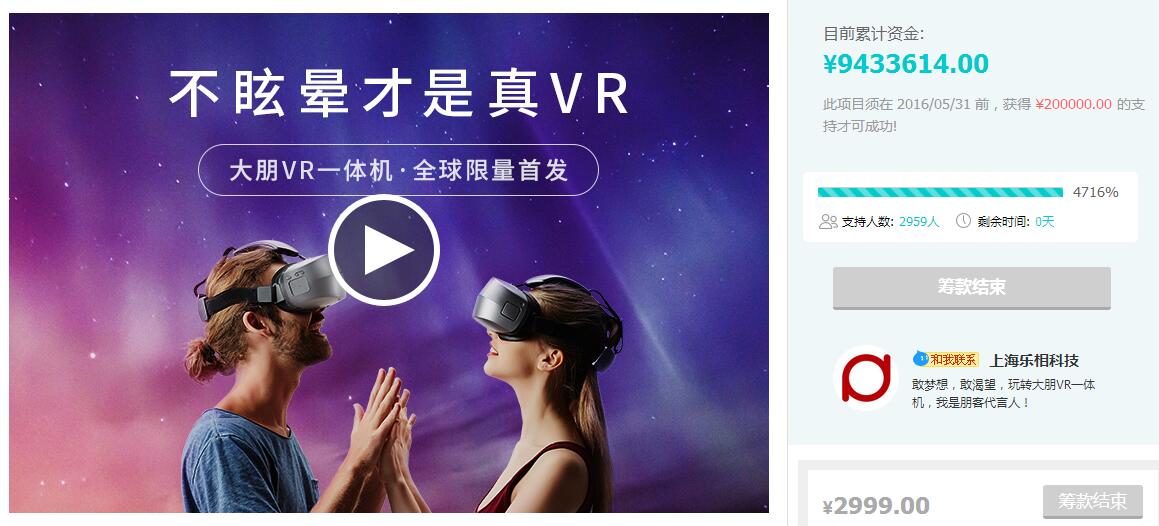 4月1日,開啟淘寶眾籌,售價2999元的大朋VR一體機最終以¥9433614眾籌金額,創(chuàng)下VR行業(yè)眾籌紀(jì)錄。