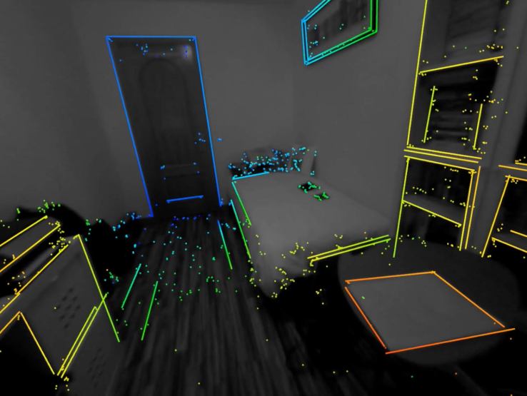 在體驗(yàn)中記者使用單一攝像頭以及固定在HTC Vive頭顯前方的IMU,即使不依靠SteamVR的基站,該系統(tǒng)也可以建立一個云空間,并且同時定義記者周偉的環(huán)境外輪廓和線條。在體驗(yàn)過程中,該系統(tǒng)的穩(wěn)定性一直很好。