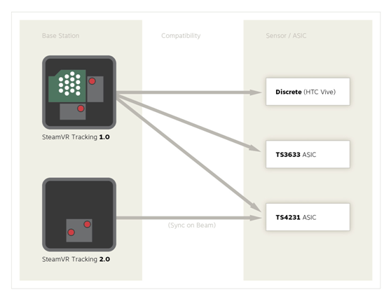 因為Valve制造的新基站不包括同步閃光燈,所以在跟蹤2.0中同步對射技術(shù)的一個副作用是這些基站只能與基于TS4231的設(shè)備配合使用。閥門制造的基站不能與舊的1.0設(shè)備一起使用。如果舊版本的1.0基站繼續(xù)使用新設(shè)備,將得不到任何新的功能。