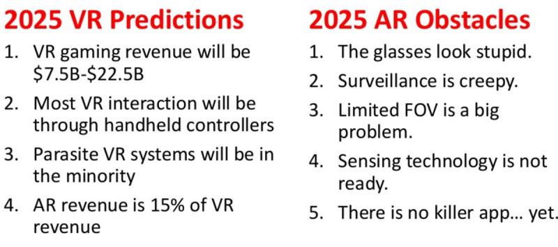 當(dāng)前Schell對VR和AR的2025年預(yù)測中,對VR的增長障礙和AR面臨的挑戰(zhàn)表示擔(dān)憂。他認(rèn)為,到2025年,VR將達(dá)到75億至225億美元的市場份額。這可能看起來樂觀,但他表示其他預(yù)測是非常錯誤的。到2025年,他認(rèn)為VR將不會超過整體游戲行業(yè)的5%至15%。
