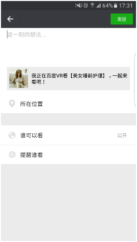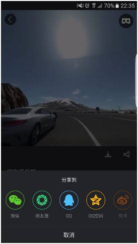 百度VR安卓1.8版本還有一大重點(diǎn)是分享功能,可將當(dāng)前查看內(nèi)容分享至微信、微信朋友圈、QQ、QQ空間等主流社交平臺(tái)。