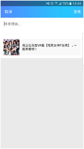 我在百度VR看【宅男女神T臺(tái)秀】,一起來(lái)看吧!把它分享至你的社交圈內(nèi),發(fā)表一下你的轉(zhuǎn)發(fā)感言,與好朋友們一起分享。自己獨(dú)樂(lè)樂(lè)不如大家共樂(lè)樂(lè)!這便是百度VR安卓1.8版本的宗旨。