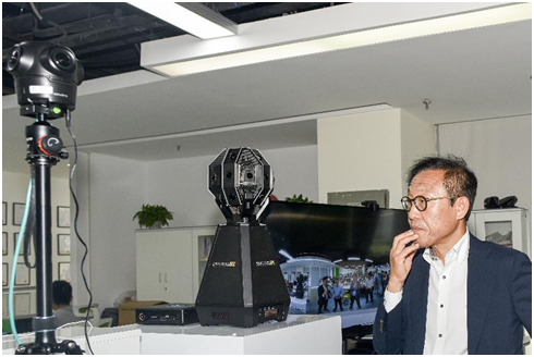 圖:Kim博士參觀VR全景攝像機(jī)IDEALOEYE C4(左)和P21(右)
