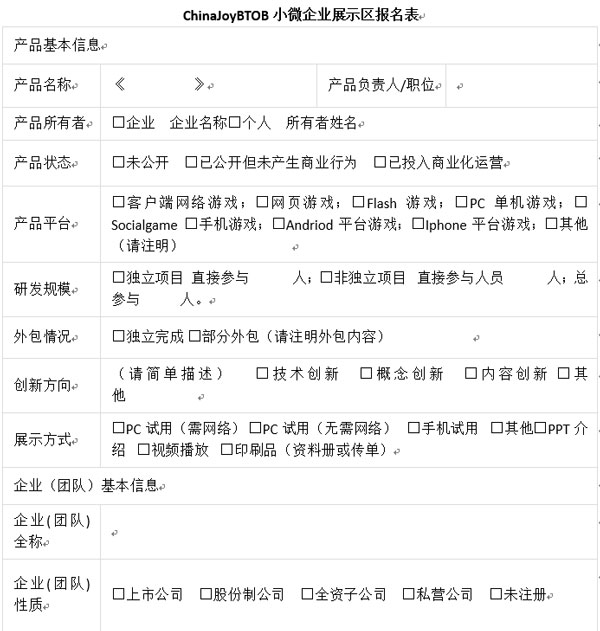 i. 填寫《ChinaJoy小微企業(yè)展示區(qū)報名表》(見下表);