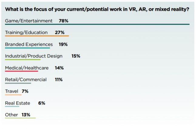 調(diào)查涵蓋了VR/AR/MR所涉及的各種領域:游戲/娛樂、教育/培訓、品牌延伸、工業(yè)/產(chǎn)品設計、醫(yī)療/保健等。其中有78%的人表示他們的工作和游戲/娛樂相關,占據(jù)了目前行業(yè)開發(fā)人員的大部分。目前幾大主流平臺,如HTC Vive、OculusRift以及PS VR本質(zhì)上都是作為游戲發(fā)售平臺。在移動VR平臺方面,Gear VR和Daydream均以娛樂和游戲應用為主。消費者購買VR頭顯最主要的目的也是娛樂和游戲。