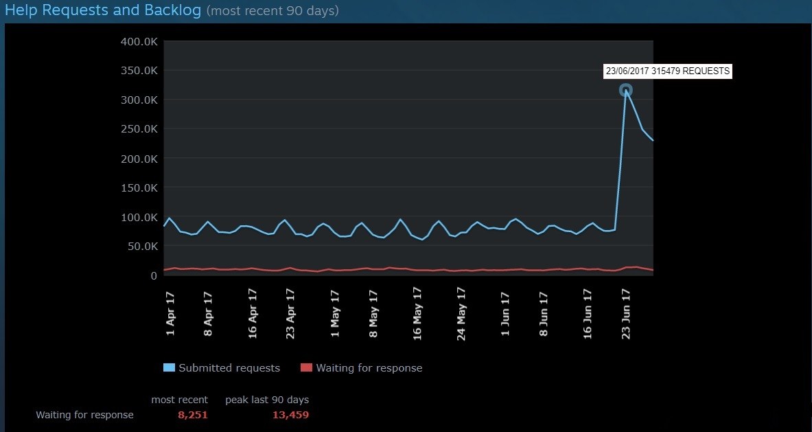 通常來說,Valve平均每天收到7萬5千條左右的退款申請,多的時候會達到10萬。從圖中我們可以看到,6月23日,公司收到31.5萬條退款申請,第二天下降到了29.6萬。6月25日是27.3萬,28日22.8萬。