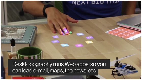 Desktopology硬件可將計(jì)算器或地圖等投影到桌面上,以智能手機(jī)屏幕運(yùn)行相似的方式與投影進(jìn)行交互和移動(dòng)。如果諸如杯子的對象被放置在投影中,軟件將投影圖像移動(dòng)到打開的位置,投影也可以與特定的物體“鏈接”,實(shí)現(xiàn)地圖或壓光機(jī)這樣的物體被鏈接到一本書,而投影也將沿著書本移動(dòng)。
