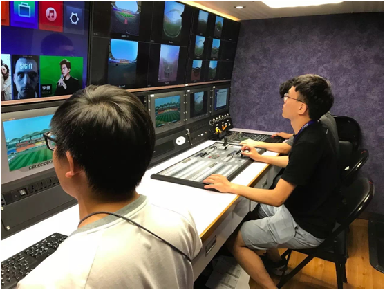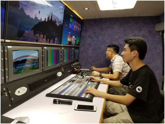 工作人員在轉(zhuǎn)播車內(nèi)進行調(diào)試
