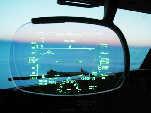HUD是利用光學(xué)反射的原理,將重要的飛行相關(guān)資訊投射在一片玻璃上面。這片玻璃位于座艙前端,高度大致與飛行員的眼睛成水平,投射的文字和影像調(diào)整在焦距無限遠(yuǎn)的距離上面,飛行員透過HUD往前方看的時(shí)候,能夠輕易的將外界的景象與HUD顯示的資料融合在一起。HUD設(shè)計(jì)的用意是讓飛行員不需要低頭查看儀表的顯示與資料,始終保持抬頭的姿態(tài),降低低頭與抬頭之間忽略外界環(huán)境的快速變化以及眼睛焦距需要不斷調(diào)整產(chǎn)生的延遲與不適。