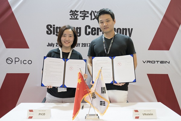 除了產(chǎn)品收獲了業(yè)界和體驗者的雙重口碑外,Pico在ChinaJoy期間再放出幾個大招。7月27日下午,Pico與三星集團首家投資的韓國VR軟體開發(fā)商VROTEIN舉行簽字儀式,達成長期戰(zhàn)略合作關(guān)系。Pico負責(zé)人透露,雙方將在VR內(nèi)容資源的引進、線下體驗項目的拓展,以及在韓銷售推廣等方面開展長期合作。
