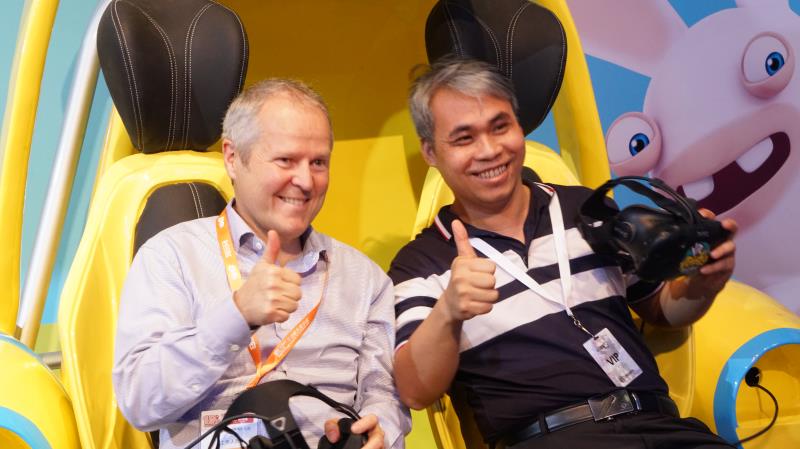 玖的董事長梁應(yīng)滔與育碧大中華區(qū)VP Aurelien體驗新品