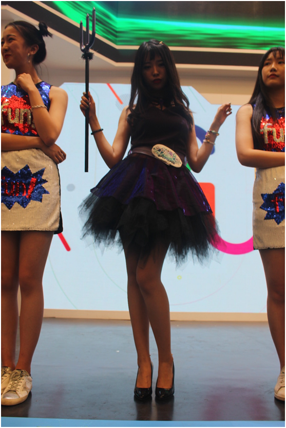 美女主持人的裙子紋路好評,手里的獎品應(yīng)該是電腦包包吧。