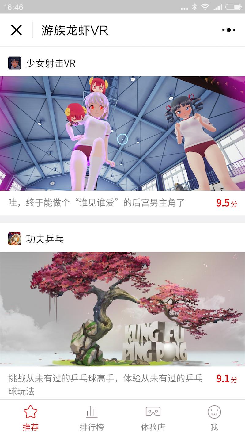 進(jìn)入游族龍蝦VR小程序,首先我看的是一些推薦的VR游戲。從頁面底部的四個圖標(biāo)可以看出,本程序的內(nèi)容主要包括四大部分,那就是推薦、排行榜、體驗店和我(用戶信息),下面我從推薦頁面開始說起。