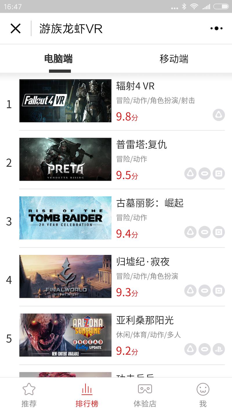 從游戲詳情頁面退出,點擊排行榜,我看到了一個VR游戲排行榜。據(jù)我的觀察,榜單是根據(jù)評分進(jìn)行排序的,而且還分為電腦端和移動端兩個板塊。通過排行榜用戶可以快速找到那些最優(yōu)秀的VR游戲,同時用戶的評分也會影響游戲的排名。我認(rèn)為這個功能對于游戲玩家是非常有價值的,因為目前很多游戲玩家對于VR以及VR游戲還是比較陌生的,就算他們到了體驗店,他們也不知道到底哪些游戲比較好玩,現(xiàn)在有了排行榜和推薦功能,這些玩家可以第一時間了解到最優(yōu)秀的VR游戲。說到這里我突然發(fā)現(xiàn),本小程序在功能很像是貓眼這樣的電影APP,都是幫助用戶更好的找到想要的內(nèi)容。