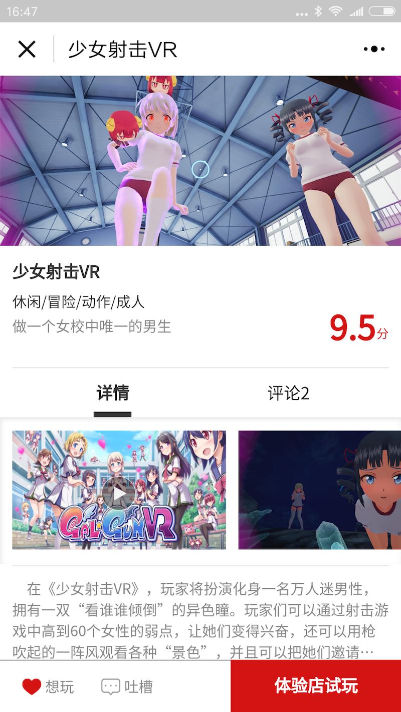 在推薦頁面點擊某款游戲,就可以查看游戲的詳細(xì)信息,除了游戲的介紹、視頻和圖片、對應(yīng)的平臺、所需的硬件配置等信息,我還看到了游戲的評分和評論,而我作為用戶,也可以點贊(想玩)和評論(吐槽)。除此之外,頁面上還有一個紅色按鈕標(biāo)注著“體驗店試玩”,點擊這個按鈕就可以進(jìn)入體驗店頁面,這部分我后面再細(xì)說。對于游戲詳情頁面,我個人非常滿意,因為它基本上包含了關(guān)于一款VR游戲的全部內(nèi)容,同時用戶對于游戲的評分和評論也非常重要,而我可以在這個頁面看到以上全部的內(nèi)容。