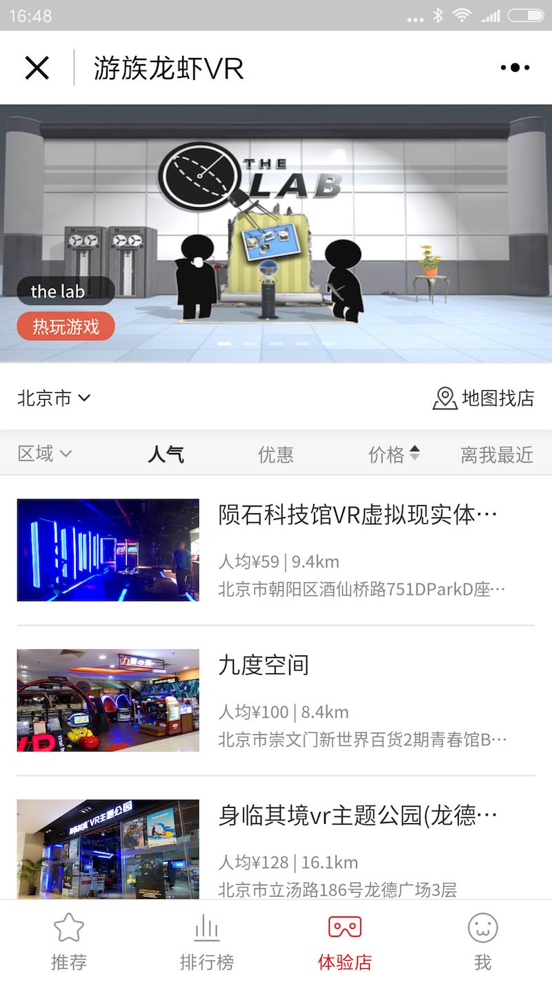 除了查找VR游戲,本小程序還提供了查找體驗店的功能。在頁面底部點擊體驗店圖標(biāo),或者在游戲詳情頁面點擊“體驗店試玩”按鈕,都可以進(jìn)入體驗店頁面。進(jìn)入體驗店頁面之后,我發(fā)現(xiàn),系統(tǒng)根據(jù)我所在的位置自動顯示對應(yīng)的體驗店信息列表,同時我還可以根據(jù)人氣、優(yōu)惠、價格和位置(離我最近)進(jìn)行信息排序,感覺越來越像電影APP了,對吧?
