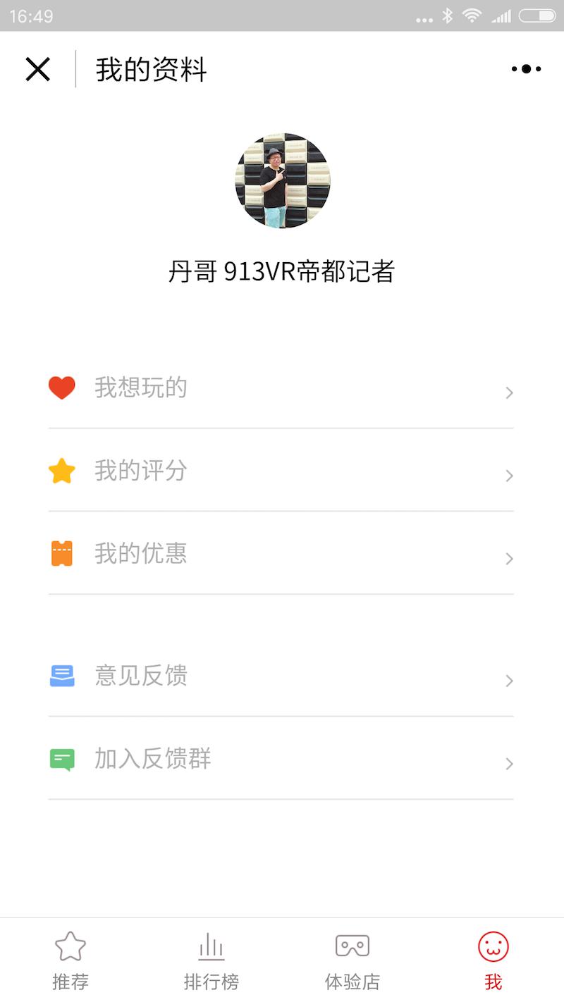 看過了游戲和體驗店,本程序的最后一部分功能就是我(用戶信息)了,在這里用戶可以查看自己喜歡的游戲和評論等信息。我相信,隨著VR用戶的數(shù)量越來越多,大家體驗過的游戲越來越多,老玩家看著自己的評分和評論也會頗有一種成就感。
