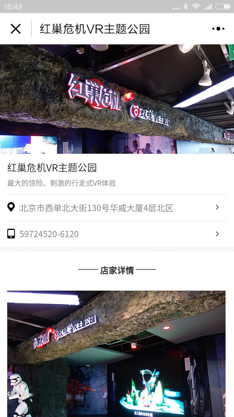 返回體驗店頁面,按照“離我最近”的方式進(jìn)行排序,我找到了位于西單的蟻視“紅巢危機(jī)”VR主題樂園。點擊這家店,進(jìn)入體驗店詳情頁面,在這里我可以查看體驗店的介紹、圖片、位置和聯(lián)系方式,這樣的內(nèi)容對于一個想嘗試體驗VR內(nèi)容的潛在用戶來說確實非常有幫助。如果能夠在未來能夠加上用戶對于體驗店的評價,那就更加完美了。