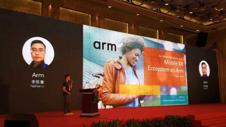 Arm生態(tài)系統(tǒng)負(fù)責(zé)人李陳魯,以《Arm移動XR生態(tài)系統(tǒng)》為題。Arm作為全球芯片IP 的領(lǐng)軍企業(yè),從生態(tài)層面全面助力VR/AR/MR產(chǎn)業(yè)進(jìn)步,將對VR/AR/MR產(chǎn)業(yè)的發(fā)展帶來新的生機。李陳魯講解了ARM移動生態(tài)系統(tǒng),以及VR/AR/MR在該系統(tǒng)中的重要地位,并將與 Nibiru 共同合作的VR聯(lián)合實驗室做了詳細(xì)講解。