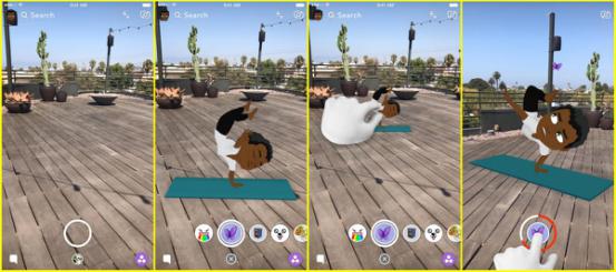 在最新的功能中,你可以把 Bitmoji 中的人物以 3D 動(dòng)畫的形式放置在現(xiàn)實(shí)世界,任意調(diào)整大小和角度,與周圍的環(huán)境進(jìn)行互動(dòng)。在 Snapchat 中要先綁定 Bitmoji 賬號(hào),3D Bitmoji 形象以特效濾鏡的形式加在 World Lenses 中。打開后置攝像頭,點(diǎn)擊屏幕會(huì)彈出濾鏡選項(xiàng),選擇一個(gè),你就可以看到自己制作的形象在地板上做瑜伽,喝咖啡,彈吉他……