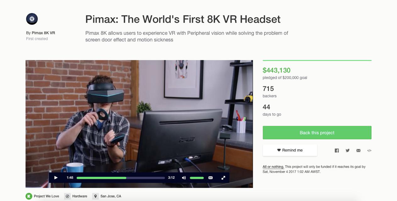 記者從Kickstarter網(wǎng)站看到,小派科技此次設(shè)定的眾籌目標(biāo)是20萬(wàn)美金,時(shí)間45天。然而美國(guó)西岸早上10點(diǎn)眾籌上線后,僅用了1個(gè)小時(shí)即完成了眾籌目標(biāo),且數(shù)字一直在快速增長(zhǎng),截止發(fā)稿前,眾籌活動(dòng)已進(jìn)行5個(gè)小時(shí),眾籌金額已經(jīng)超過(guò)50萬(wàn)美金,完成度250%,超過(guò)了之前日本VR項(xiàng)目Fove在kickstarter眾籌48萬(wàn)美金的目標(biāo),也成為了Kickstarter上面金額最大的亞洲VR眾籌項(xiàng)目。Kickstarter官方更是在此時(shí),將小派8K眾籌活動(dòng)貼上了“Project We Love”的標(biāo)簽,進(jìn)行了主動(dòng)推薦!