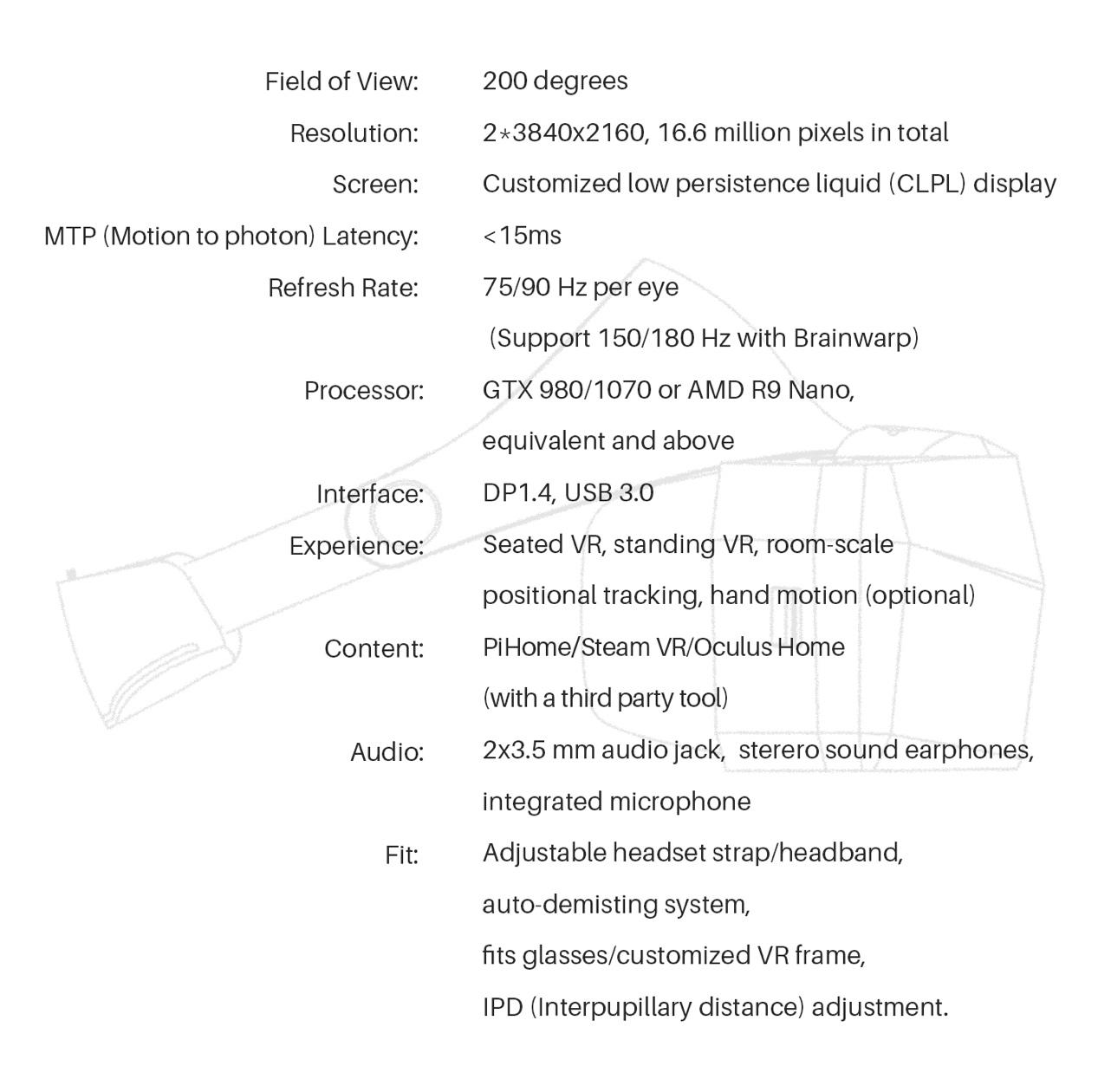 據(jù)小派科技官方信息,小派8K擁有2*3840*2160的雙目8K分辨率,清晰度是當(dāng)前市場(chǎng)主流2K VR的16倍。同時(shí)小派8K首次將視場(chǎng)角從目前主流的110度拓展到了200度,逼近于人類視場(chǎng)角度極限,使得VR更加接近大場(chǎng)景的沉浸感。而大家普遍關(guān)注的眩暈問(wèn)題,在小派8K產(chǎn)品上也得到了解決,因?yàn)樾∨?K通過(guò)進(jìn)一步對(duì)屏幕和軟件算法的優(yōu)化,將整體延時(shí)控制在了15ms以內(nèi)。在VR業(yè)內(nèi),20ms是及格,18ms是優(yōu)秀,而15ms已經(jīng)是精英,且全球公布的VR參數(shù)來(lái)看,小派8K是第一款達(dá)到這個(gè)級(jí)別的產(chǎn)品。