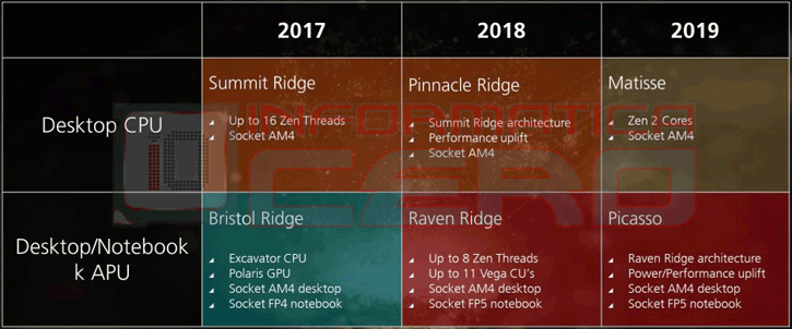 處理器方面,AMD會(huì)在明年推出Summit Ridge的升級(jí)版“Pinnacle Ridge”,在大致性能上沒(méi)有太大差別,只是優(yōu)化提升能耗比。而第二代Zen核心產(chǎn)品“Matisse”則要等到2019年,依舊還是采用AM3接口,其余信息未知。