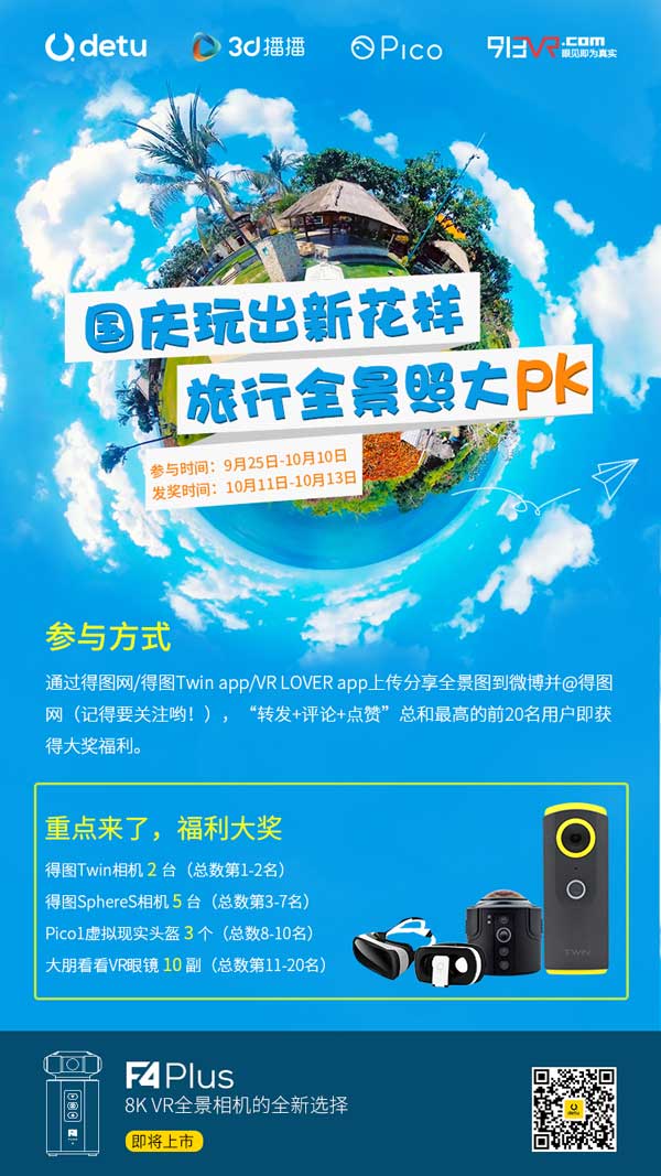 得圖還聯(lián)合3D播播、Pico、913VR同時(shí)推出“國(guó)慶玩出新花樣,旅行全景照大PK”全景圖有獎(jiǎng)分享活動(dòng),9月25日-10月10日期間上傳分享全景圖到微博,贏取驚喜豪禮!